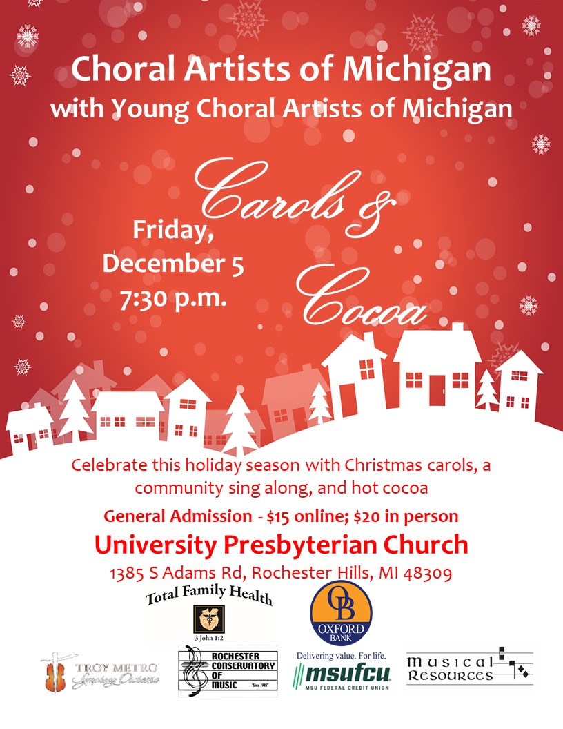 The Choral Artists of Michigan are pleased to present Carols and Cocoa. Celebrate this holiday season with Christmas carols, a community sing along, and hot chocolate at the University Presbyterian Church, 1385 S Adams Rd, Rochester Hills, MI 48309, Friday, December 5, 7:30 p.m. General Admission is $15 online before December 4 at 10 p.m. and $20 at the door. We recommend this discount by securing online ticket reservations ahead.